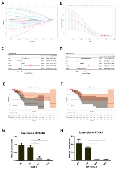 Prognostic analysis of candidate genes and knockout of PCSK6 in the cell lines SUIT-2 and MIA PaCa-2. (A) Lasso Cox regression analysis of 29 liver metastasis related genes. y-axis represents lasso coefficients and x-axis represents -log (Lambda) values. (B) Cross validation of the obtained genes via Lasso Cox regression. y-axis represents partial likelihood deviance and x-axis represents -log (Lambda) values. Dotted vertical line indicates the minimum and 1 standard error of Lambda values. The minimum values of Lambda were used as punishment coefficients for analysis. (C,D) Forest plots of univariate and multivariate Cox analysis. Five genes (p < 0.1) obtained via univariate analysis were further included in the multivariate analysis. (E,F) Kaplan–Meier survival plots of PCSK6 and C2. (G) Expression of PCSK6 mRNAs in SUIT-SCs and controls. (H) Expression of PCSK6 mRNAs in MIA-SCs and controls.