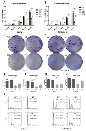 Stages S and G2 of the cell cycle indicated the status of cell division. The proportions of stage S + G2 cells in single clones of SUIT-2 were diminished compared to controls (Figure 3G,I) (SC1 32.1833 ± 0.4900, SC2 34.2267 ± 0.7184, WT 51.4967 ± 0.6901, NC 49.4700 ± 0.8126, WT vs. NC p = 0.043, NC vs. SC1 p < 0.001, and NC vs. SC2 p < 0.001). A lower proportion of stage S + G2 cells was also observed in one single clone of MIA PaCa-2 compared to controls (Figure 3H,J) (SC1 35.5667 ± 5.1081, SC2 47.0667 ± 2.8936, WT 55.3000 ± 1.9975, NC 51.9667 ± 2.8676, WT vs. NC p = 0.708, NC vs. SC1 p = 0.003, and NC vs. SC2 p = 0.430).