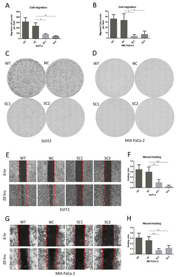 In the wound healing assay, the healing ratios in single clones of SUIT-2 decreased significantly compared to controls (Figure 4E,F) (SC1 0.1984 ± 0.1089, SC2 0.0671 ± 0.0324, WT 0.6900 ± 0.1740, NC 0.5992 ± 0.1819, WT vs. NC p = 0.732, NC vs. SC1 p = 0.001, and NC vs. SC2 p < 0.001). Consistent results were found in single clones of MIA PaCa-2 compared to controls (Figure 4G,H) (SC1 0.0760 ± 0.0294, SC2 0.1177 ± 0.0466, WT 0.3116 ± 0.0825, NC 0.2621 ± 0.0668, WT vs. NC p = 0.572, NC vs. SC1 p < 0.001, and NC vs. SC2 p = 0.005).