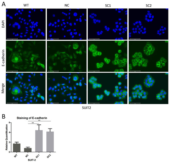 Knockout of PCSK6 induced the redistribution of E-cadherin at cell–cell junctions. (A) Immunofluorescence staining of E-cadherin (green), DAPI (blue), and merge in SUIT-SCs and controls. Scale bar = 75 μm. Diffuse and strong staining of E-cadherin was found at cell–cell gaps in single clones of SUIT-2, whereas scattered and weak staining of E-cadherin was found in WT or NC. (B) Relative quantification of E-cadherin staining at cell–cell junctions in SUIT-SCs and controls. SC1 = 4.4453 ± 1.0974, SC2 = 4.1570 ± 0.6033, WT = 1.7237 ± 0.2899, NC = 0.8093 ± 0.2007 (WT vs. NC p = 0.446, NC vs. SC1 p = 0.001, NC vs. SC2 p = 0.002).