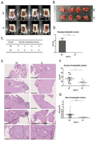 The tumor xenograft model of intrasplenic injection simulated the processes of tumor cells colonizing in the liver via the bloodstream, interacting with the microenvironment and generating metastatic niches. No tumor-planting lesions or ascites within the abdominal cavity were evident (Figure 7A). In macroscopic examinations (Figure 7B–D), prominent metastatic lesions were found at different lobes of the liver in the NC group of SUIT-2, in contrast no visually metastatic lesions were found in the SC group (NC 2 ± 0.408, SC 0, p = 0.003). In microscopic investigations, the SC group of SUIT-2 showed fewer counts of metastatic niches in the liver compared to the NC group (Figure 7F) (SC 15.75 ± 9.937, NC 32.33 ± 19.593, p = 0.019). Furthermore, obviously smaller sizes of metastatic niches within the liver were found in the SC group of SUIT-2 compared to the NC group (Figure 7E,G) (SC 0.0498 ± 0.0434, NC 0.2070 ± 0.3597, p < 0.001).