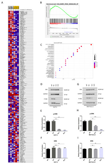 Knockout of PCSK6 suppressed the Raf-MEK1/2-ERK1/2 axis. (A) Heatmap of the expressions of genes involved in the Kras signaling pathway between the PCSK6-high group and the PCSK6-low group. (B) Enrichment plot of the Kras signaling pathway. (C) Top 20 enrichment categories of BP. (D–F) Activities of ERK and p-ERK in SUIT-SCs and controls. (E,F): relative quantitation of p-ERK and ERK in Western blot (Intensity ratios of the bands). (G–I) Activities of ERK and p-ERK in MIA-SCs and controls. (H,I): relative quantitation of p-ERK and ERK in Western blot (Intensity ratios of the bands). Additional bands at 42/44 kd locating superior to GAPDH bands resulted from reprobing of the membrane in (D,G).