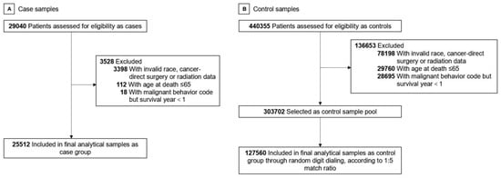 Study Flowchart. (A) Case sample selection. (B) Control sample selection.
