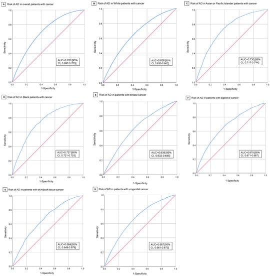 Receive-Operating Characteristics Curves for Risk of AD in Cancer Patients. (A) Risk of AD in overall cancer patients. (B) Risk of AD in White cancer patients. (C) Risk of AD in Asian/Pacific Islander cancer patients. (D) Risk of AD in Black cancer patients. (E) Risk of AD in breast cancer patients. (F) Risk of AD in digestive system cancer patients. (G) Risk of AD in skin and soft tissue cancer patients. (H) Risk of AD in urogenital cancer patients.