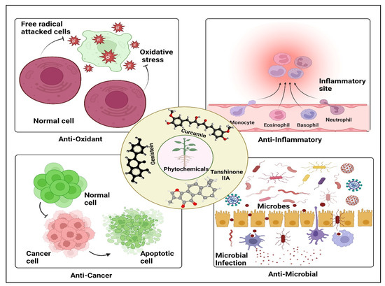 Representative figure highlighting some of the therapeutic potentials of curcumin, genistein, and tanshinone IIA. These phytochemicals have been shown to possess intriguing anti-microbial, anti-inflammatory, anti-oxidant, and anti-cancer potentials. The figures are prepared with the BioRender Software (biorender.com).