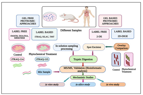 Over the last two decades, various mass spectrometry (MS)-based high throughput proteomic approaches have been widely utilized for a plethora of applications [215,216]. As a matter of fact, the proteomic analysis deals with the profiling, identification, and quantification of proteins as well as peptides in different biological samples [217]. Conventionally, it comprises of various gel-based techniques such as two-dimensional gel electrophoresis (2-DE), two-dimensional differential gel electrophoresis (2D-DIGE), and gel free techniques. For example, these include stable isotope labeling by amino acids in cell culture (SILAC), isobaric tag for relative and absolute quantitation (iTRAQ), tandem mass tags (TMT), label free quantitation (LFQ) analysis, and multiple reaction monitoring (MRM). For a comprehensive review on proteomics-based technology, please refer to articles by Beck et al., [218] and Domon et al., [219]. Here, we have described the proteomics-based studies of Cur, Gen, and Tan IIA in detail. An overview of the proteomics strategies exploited to study the underlying molecular intricacies for phytochemical-based therapeutic interventions has been depicted in Figure 2.