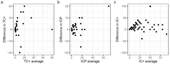 Bland–Altman plots for the three components scored. (a) TC+, (b) ICP and (c) IC+.