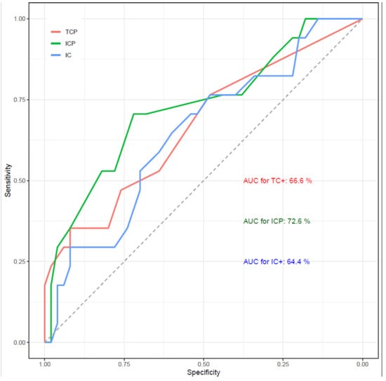 Area under the curve for best overall response for TC+ (red), ICP (green) and IC+ (blue).