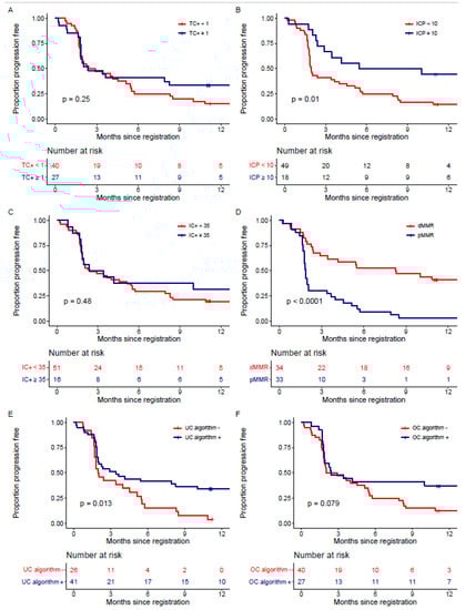Kaplan–Meier curves for progression-free survival for (A) TC+, (B) ICP, (C) IC+, (D) MMR, (E) the urothelial cancer (UC) algorithm and (F) the optimal cutpoint (OC) algorithm.