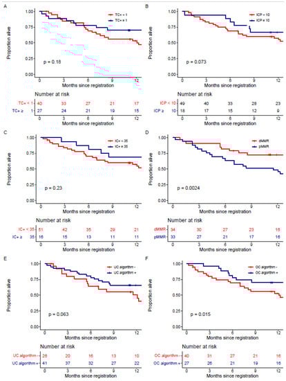 ICP ≥ 10 was found to be prognostic for PFS (logrank p = 0.01), while TC+ (p = 0.25), IC+ (p = 0.48) and the UC algorithm (p = 0.08) were not (Figure 3). In a model adjusting for MMR status and ICP ≥ 10, pMMR was associated with poorer PFS (HR for pMMR 2.99, 95% CI: 1.61–5.57, p < 0.001), and ICP ≥ 10 was no longer associated with PFS (HR for ICP ≥ 10 0.59, 95% CI 0.28–1.23, p = 0.16). None of the individual PD-L1 cutpoints were prognostic for OS (TC+ p = 0.18, ICP p = 0.07 or IC+ p = 0.23, Figure 4). Comparisons of univariate and adjusted models for PFS and OS are given in Table S3. The UC algorithm was associated with OS (logrank p = 0.02), but not after adjustment for MMR status (HR for UC algorithm: 0.53, 95% CI: 0.25–1.12, p = 0.10). While the UC algorithm was not prognostic for OS (p = 0.063, Figure 4E), it was for PFS (p = 0.013, Figure 3E); however, it did not remain prognostic after adjustment for MMR status (p = 0.35).