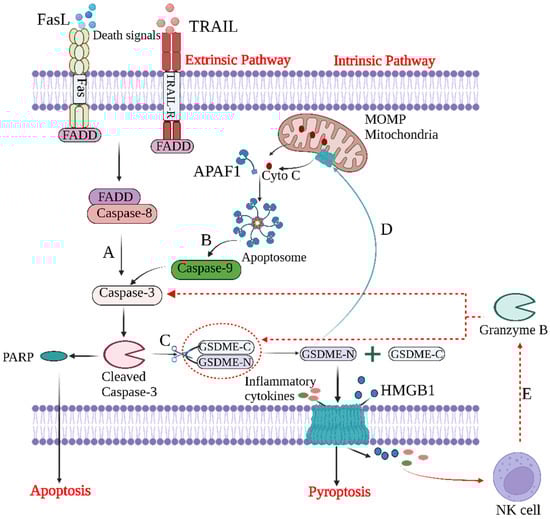 The crosstalk between apoptosis and GSDME-dependent pyroptosis. (A) The extrinsic pathway and (B) intrinsic pathway of apoptosis. (C) GSDME-mediated pyroptosis. After caspase-3 cleavage, GSDME is activated to produce GSDME-N, which is transferred to the plasma membrane and perforated, releasing inflammatory cytokines and HMGB1. (D) GSDME-N targets mitochondrial membranes to form pores, leading to the release of cytochrome C and the activation of caspase-3, enhancing pyroptosis. (E) Granzyme B released by NK cells can, on the one hand, activate caspase-3, and, on the other hand, directly cleave GSDME to cause pyroptosis.