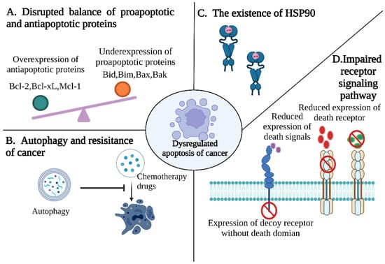 Most cancer treatments aim to eliminate malignant cells by inducing apoptosis and other related cell deaths. However, with the increasing use of drugs, the antiapoptotic ability of tumor cells is gradually enhanced. Generally speaking, antiapoptotic pathways are mainly divided into the following mechanisms: (1) The disruption of the balance of proapoptotic and antiapoptotic proteins (Figure 3A). For example, the leukemia 2 (bcl-2) family are among the earliest studied genes associated with apoptosis. Bcl-2 plays a key role in the regulation of apoptosis, and is composed of proapoptotic and antiapoptotic proteins. When the balance between them is disrupted, this leads to an imbalance in apoptosis [28]. For example, myeloid cell leukemia 1 (McL-1), a member of the Bcl-2 family, is highly expressed in tumors, thereby blocking apoptosis, and has been found to be implicated in chemotherapy resistance [29,30]. Therefore, the imbalance between antiapoptotic protein and proapoptotic protein causes the apoptosis ability of cancer cells to be disordered, and, thus, resistant to various chemotherapy drugs. (2) Autophagy and cancer resistance of (Figure 3B) can maintain intracellular balance by removing dysfunctional organelles and removing cellular stress so as to prevent cell damage caused by chemotherapy drugs. Studies have shown that autophagy significantly inhibits the efficacy of a variety of anticancer drugs, protecting cancer cells from apoptosis and helping to acquire drug resistance [31]. (3) The existence of heat shock protein 90 (hsp90). The content of hsp90 in cancer cells (Figure 3C) is higher than that in normal cells. As a molecular chaperone, it assists the folding, stabilization, and maturation of different types of oncoproteins, thereby resisting apoptosis induced by chemotherapy drugs and promoting tumor proliferation, migration and metastasis. (4) The decreased surface expression or function of death receptor signaling (Figure 3D) can lead to the reduced apoptosis of tumor cells. For example, the downregulation of CD95 expression in neuroblastoma cells is related to its acquired drug resistance.
