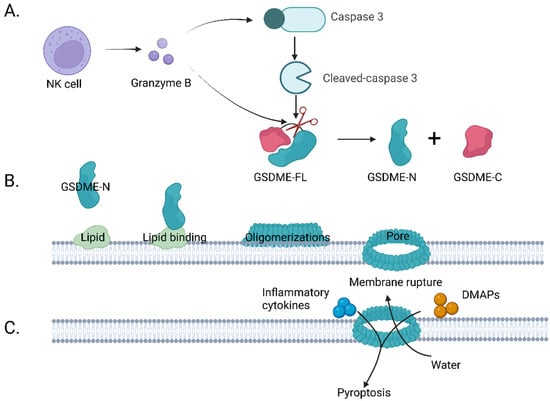 The physiological function and biochemical mechanism of GSDME still require elucidating, but its mechanism of inducing pyroptosis has been explored by many researchers. Similar to GSDMD, it mainly induces pyroptosis through three steps (Figure 6). First, the GSDME-N-terminal fragments liberate (Figure 6A). Studies have shown that the full-length GSDME protein does not have the ability to induce pyroptosis [11]. It contains an N-terminal domain and a C-terminal connected with a linker motif of approximately 30–100 amino acids, forming an autoinhibitory mechanism. When caspase-3 is activated, it cleaves a peptide segment consisting of four amino acids (DMPD) in a middle linker motif of GSDME to release the N-terminal with pore-forming activity. Then, the GSDME binds lipids in the cell membrane and oligomerizes to form functional pores [41] (Figure 6B). The pore-forming process of the GSDME-N contains multiple steps, including lipid binding, assembly, and forming functional pores. Studies have shown that the GSDME-N-terminus can bind to phospholipids on the membrane and oligomerize to form pores, which may be related to the positive charge of the GSDME-N-terminus, and the negative charge of the phospholipids; therefore, they can bind through an electrostatic interaction [11]. Notably, GSDME-N does not have strong affinity for every phospholipid. The phospholipid-binding assay verified that GSDME mainly binds to intracellular phospholipids (PSs) and phosphatidylinositol phospholipids (PIPs), rather than extracellular phospholipids to oligomerize into pores [11]. In addition, GSDME was shown to have little binding force to cardiolipin in mitochondrial membranes, but the liposome leakage experiments showed that it has a strong perforation ability in mitochondria, which indicates that GSDME can oligomerize perforation with only a very slight binding force to phospholipids. Next, cell membrane swelling and rupture (Figure 6C) studies have shown that the oligomerization of the gasdermin-N-terminus on the membrane mainly forms small pores with a diameter of 10–15 nm, and with the assistance of osmotic pressure difference, small inflammatory molecules such as interleukin-1β(IL-1β) and interleukin-18 (IL-18) are perforated and released outside the cell, attracting relevant immune cells to create a highly immune inflammatory microenvironment [9].