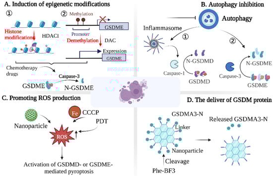 Strategies to promote pyroptosis in tumor cells. Induced pyroptosis can be divided into four dimensions: (A) induction of epigenetic modifications; (B) autophagy inhibition; (C) promoting ROS production; (D) the delivery of GSDM protein.