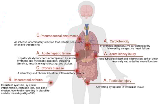 Pyroptosis is regarded as the first line of defense against danger. When cells are infected by pathogens, they often cause cell damage and release proinflammatory mediators, including IL-1β and HMGB1, to recruit immune cells, including macrophages. Pyroptosis can protect the body from infection and injury to a certain extent, but the excessive activation of this pathway often causes body damage, such as the induction of inflammatory diseases. In other word, the accumulation of numerous inflammatory cytokines could induce certain diseases, causing serious damage to the body, such as sepsis, pneumonia [83], Crohn’s disease [84], etc. (Figure 8C). Sepsis is the most classic example of a pyroptosis-related inflammatory disease. It is a life-threatening disease caused by the dysregulation of the body’s response to infection, which leads to multiorgan dysfunction [85]. The pathology of sepsis is complex, presenting with rapid progress and high mortality. There has been no effective drug treatment developed thus far, resulting in clinics mainly relying on antibiotics and organ function support, but of which the cost is high [86,87]. Even after a successful treatment response, there are still many life-long complications of the disease, which seriously affect the quality of life. Based on this, the search for effective drugs to treat sepsis is of great significance. A recent study mentioned that the excessive activation of pyroptosis is an important cause of the immune dysregulation of sepsis and an increased risk of death [88]. Studies have shown that sepsis is associated with GSDMD, but whether it is related to the activation of GSDME remains to be elucidated [89]. Therefore, an in-depth elucidation of the pathophysiological mechanisms between pyroptosis and sepsis could bring new light to the treatment of sepsis.