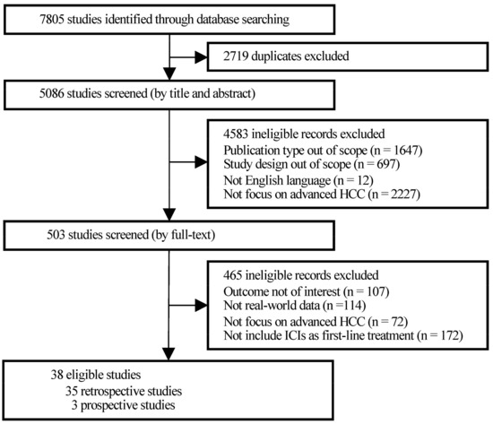 The study selection criteria, according to the PICOS approach, were presented in Table S1 [26]. Real-world utilization published in English were included regardless of whether they were prospective or retrospective design. The patients of interest were adults diagnosed with an advanced stage (unresectable or metastatic) HCC who had never received any systemic therapy. Patients were defined as having advanced disease if they had disease progression after or were not eligible for surgical treatments and LRTs. Although a range of ICIs were included in the initial search, only those that were used as first-line treatment were included considering the objective of this study. Studies that evaluated the clinical outcomes, such as median PFS, median OS, objective response rate (ORR), disease control rate (DCR), and treatment-related adverse events (TRAEs), were analyzed. Reviews, case reports, editorials, commentaries, in vitro studies, animal studies, and protocols were excluded.
