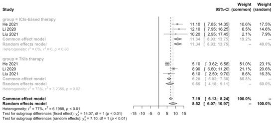 A meta-analysis was performed to compare first-line ICIs-based therapy and TKIs therapy in terms of median PFS. We confirmed that ICIs-based therapy (11.34 months; 95% CI: 8.93–13.75) showed PFS benefit compared with TKIs therapy (6.65 months; 95% CI: 4.18–9.11; p < 0.01) in real-world practice (Figure 2).