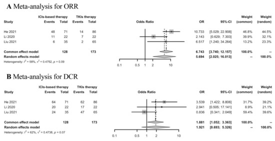 Thirty-five studies were included in the analyses of the best response of first-line ICIs-based therapy in the real world. To determine the response rates of ICIs-based therapy versus TKIs therapy in the first-line setting, meta-analysis was conducted in three studies. ICIs-based therapy showed ORR benefit compared with TKIs therapy, while the DCR was similar in both groups (Figure 3).