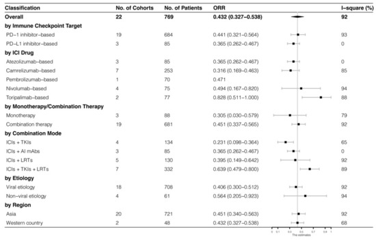 The analyses were further stratified by different ICIs-based therapy and RECIST criteria, which were presented in Figure 4, Figure 5, Figure 6 and Figure 7. The ORR and DCR of ICI-based therapy were 0.432 (95% CI: 0.327–0.538) and 0.756 (95% CI: 0.677–0.836), according to mRECIST 1.1, 0.317 (95% CI: 0.218–0.416) and 0.740 (95% CI: 0.644–0.835), judged by RECIST 1.1. The response rates were similar in anti-PD-1-based immunotherapy and anti-PD-L1-based immunotherapy, regardless of whether they were judged by mRECIST 1.1 or RECIST 1.1 (p > 0.05, Table 3). However, it was important that the ORR and DCR of ICIs-based combination therapy were better than that of the ICIs monotherapy (ORR: combination therapy vs. overall, p > 0.05, monotherapy vs. overall, p = 0.01; DCR: combination therapy vs. monotherapy, p = 0.002, judged by RECIST 1.1). The best response rate was observed in the ICIs + TKIs + LRTs therapy, since the triple therapy was the only regimen that had a significantly higher response rate than the overall rate (ORR: 0.639 (95% CI: 0.479–0.800) vs. 0.432 (95% CI: 0.327–0.538), p = 0.043; DCR: 0.872 (95% CI: 0.800–0.944) vs. 0.756 (95% CI: 0.677–0.836), p = 0.016, judged by mRECIST 1.1).