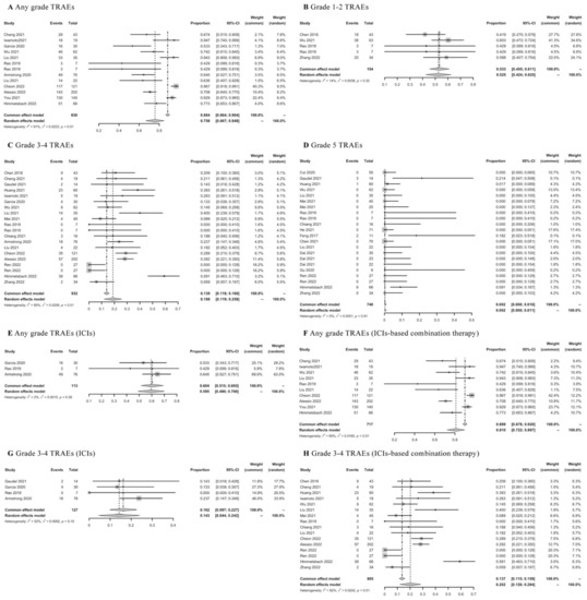 Twenty-nine real-world studies were concerned with TRAEs of first-line ICIs-based therapy. The pooled rate of any grade of TRAEs was 0.758 (95% CI: 0.667–0.848) (Figure 8A), grade 1–2 TRAEs was 0.533 (95% CI: 0.455–0.611) (Figure 8B), grade 3–4 TRAEs was 0.188 (95% CI: 0.119–0.258) (Figure 8C), and toxic deaths was 0.002 (95% CI: 0.000–0.010) (Figure 8D). Then, the results of TRAEs were further assessed according to different ICIs-based therapy. The mean rate of any grade of TRAEs was 0.604 (95% CI: 0.515–0.693) in ICIs monotherapy (Figure 8E) and 0.810 (95% CI: 0.722–0.897) in ICIs-based combination therapy (Figure 8F); the mean rate of grade 3–4 TRAEs was 0.143 (95% CI: 0.044–0.242) in ICIs monotherapy (Figure 8G), and 0.202 (95% CI: 0.120–0.284) in ICIs-based combination therapy (Figure 8H). The lower rates of any grade of TRAEs or grade 3–4 TRAEs were observed in ICIs monotherapy compared with ICIs-based combination therapy. In addition, the frequently reported TRAEs were summarized in detail in Table S6.