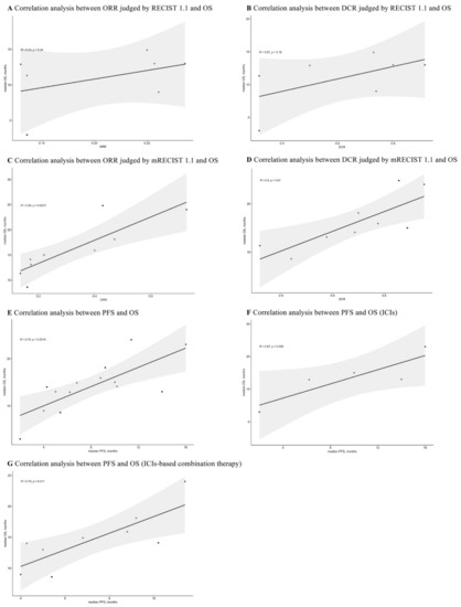Additionally, the overall correlation was 0.75 (p = 0.0019) for PFS and OS (Figure 9E). After conducting subgroup analyses (Figure 9F,G), the PFS was not correlated with OS in ICIs monotherapy (R = 0.87, p = 0.056), while it was strongly correlated with OS in ICIs-based combination therapy (R = 0.79, p = 0.011).
