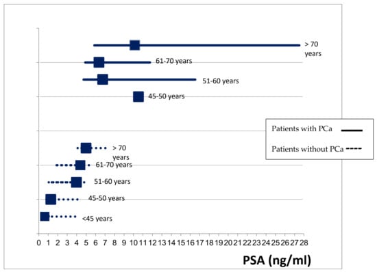 In patients who did not have a PCa diagnosis, there were differences in PSA level according to age (p = 0.001); these differences were not found in patients with PCa (p = 0.072) (Figure 1).