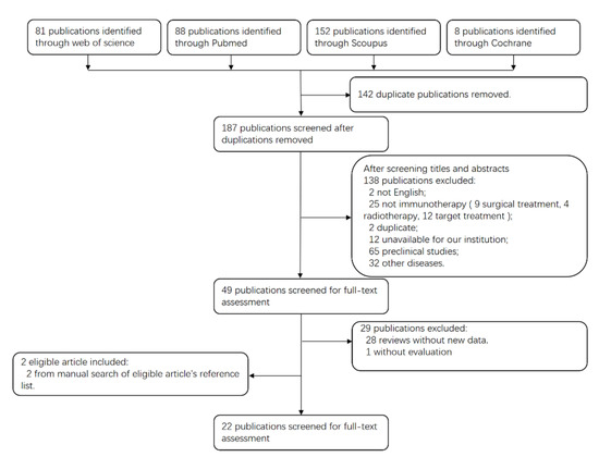 A total of 329 articles were identified in the initial screening, of which 280 were excluded after reading the abstracts. Of the remaining 49 articles, 20 met our inclusion criteria, and additional two were found eligible by manual research of the reference list of the 20 included articles. Finally, 22 article were included for this systemic review. The flowchart for the exclusion and inclusion of related studies is shown in Figure 1. These publications categorize ICIs, vaccines and other immunomodulatory drugs, according to the type of immunotherapy.