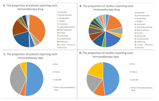 Of the included studies, the proportion of patients (A) and studies (B) reporting each immunotherapy drug, and the propotion of patients (C) and studies (D) reporting each immunotherapy type.