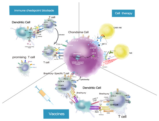 Vaccines, vaccines present brachyury antigens to dendritic cells, generating brachyury-specific T cells to kill tumor cells; Immune checkpoint blockade, immune checkpoints inhibitors enhance the killing effect of immune cells to tumors by targeting PD-1, PD-L1, CTLA-4 and other targets; Cell therapy, Immune cells modified with chimeric antigen receptors can recognize tumor antigens and kill tumors.