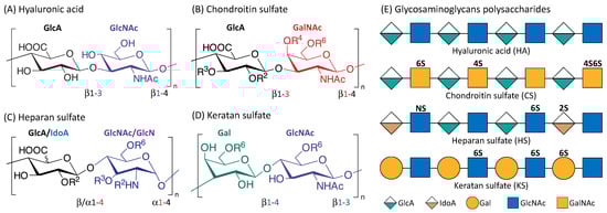 Structure of the four main glycosaminoglycans (GAGs). Disaccharide monomers of Hyaluronic acid (A); Chondroitin sulfate (B); Heparan sulfate (C) and Keratan sulfate (D). The possible sulfate sites are denoted with Ri, the superscript ‘i’ indicate the Carbon position where the sulfate group is esterified; R = H or SO3H. Representative Glycosaminoglycans polysaccharides of HA, CS, HS and KS consist of repeating disaccharides monomers with various sulfation patterns (E).