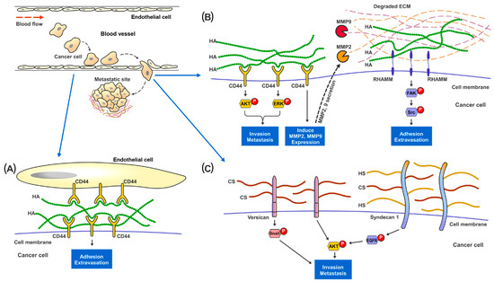 Proposed mechanisms of the involvement of GAGs in cancer metastasis. In metastatic renal cancer, HA, HS and HS present on the cell surface layer promote cancer cell invasion and metastatic capabilities. (A) During metastasis, cancer cells traveling in the blood vessel adhere to the endothelial cells through the binding and interaction between cell surface CD44 and HA present in the ECM. (B) HA-bound CD44 receptors on cancer cells activates MAPK-ERK1/2 and AKT signaling pathways to promote cell adhesion, migration and invasion. CD44 also increases MMP2 and MMP9 expression and secretion to help digest and remodel ECM proteins at the metastatic site. Cell surface RHAMM, upon the binding of HA in the ECM, activates FAK-Src signaling pathways to help cancer cells migrate through the blood vessel and start colonization at the metastatic site. (C) Cell surface proteoglycan of CS and HS, such as Versican and Syndecan-1, promote cancer invasion though activating Snail, EGFR and AKT signaling pathways.