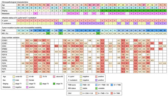 Following our previous investigation, we focused on the subset of H. pylori-positive gastric cancer patients with or without F. nucleatum infection. In this study, 36 resected gastric cancer tissue specimens, including twenty specimens with H. pylori infection, thirteen specimens with co-infection of H. pylori and F. nucleatum, and three specimens with only F. nucleatum infection, were analyzed using a TSO500 DNA panel. The age, gender, staging, metastasis, and status of H. pylori and F. nucleatum infection for the analyzed specimens are shown in Figure 1. Stratified by cancer stage, eleven specimens were from the patients of early-stage (stages 1 and 2), while twenty-five specimens were from the patients of late-stage (stages 3 and 4) disease. In the early-stage group, there were two specimens positive for F. nucleatum, while fourteen specimens were positive for F. nucleatum infection in the late-stage group. This is similar to our previous observation that patients with late-stage gastric cancer are more prone to F. nucleatum infection. The two biomarkers for assessing the overall genomic mutation load, TMB and MSI, are also shown in Figure 1. However, MSI assessment indicated that only three specimens were considered MSI-high (percentage > 20%). Although all three patients are female patients, it is likely a coincidence. Other than that, there is currently no clear association of the MSI-high status with other clinicopathological characteristics of the patients.