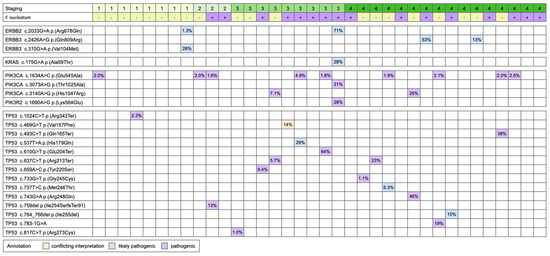 In addition to ERBB2 and ERBB3 mutations, PIK3CA was also frequently activated in our study cohort. Amongst the specimens with PIK3CA p.(Glu545Ala) mutation, one with PIK3CA p.(Thr1025Ala) and two with PIK3CA p.(His1047Arg) were identified. The specimens with activated PIK3CA accounted for one-third of analyzed specimens. The PIK3CA activation mutations are the indication for the PIK3CA inhibitor regimen for advanced or metastatic breast cancer, but their efficacy on PIK3CA-mutated gastric cancer is still under investigation. Besides cancer-driving activation mutations, frequent loss-of-function of TP53 was identified in our cohort as well. In fifteen specimens, there were eleven pathogenic, three likely pathogenic, and one VUS (variant of uncertain significance; conflicting interpretation), TP53 mutations. Activated PIK3CA mutations and loss-of-function of TP53 were concurrently found in seven specimens. These mutations appeared to not be associated with the status of F. nucleatum infection since approximately equal numbers of F. nucleatum-positive and F. nucleatum-negative specimens carry these mutations.