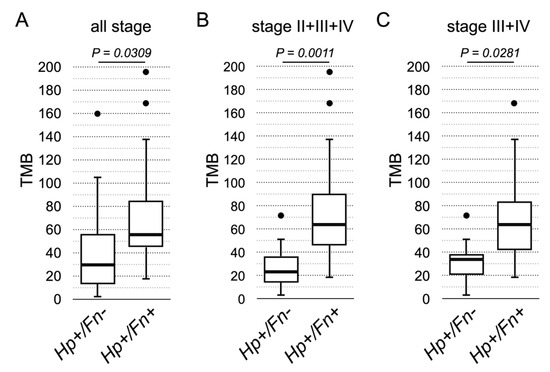 The statistical analysis of TMB between the F. nucleatum-positive and F. nucleatum-negative specimens. (A) All specimens of all stages were included for analysis (Fn− group n = 20, Fn+ group n = 16). (B) Specimens of stages 2 to 4 were included for analysis (Fn− group n = 12, Fn+ group n = 13). (C) Specimens of stages 3 and 4 were included for analysis (Fn− group n = 9, Fn+ group n = 10).