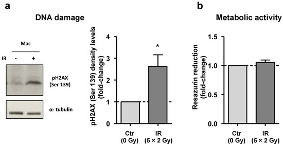 Figure 1. Despite DNA damage, irradiated macrophages remain metabolically viable. (a) DNA damage induced by cumulative ionizing radiation doses (5 × 2 Gy) in macrophages was confirmed by Western blot analysis for phosphorylated H2AX (Ser139) (ɤH2AX), 40 min after exposure to the last irradiation dose. Quantification of ɤH2AX band intensity of irradiated macrophages, normalized to the control, is represented in the graph (n = 3). (b) The metabolic activity of irradiated macrophages (n = 8) was measured using the resazurin reduction assay and normalized to that of non-irradiated ones. Mean ± SEM is presented. The whole blots (uncropped blots) showing all bands with all molecular weight markers on the Western are provided in the Supplementary Materials. * p < 0.05.
