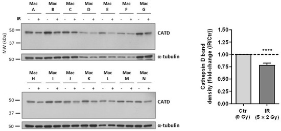 Figure 2. Validation of cathepsin D downregulation in irradiated macrophages (5 × 2 Gy), compared with non-irradiated controls. Western blot analysis of the same donors used for iTRAQ (n = 4, Mac A–D) and of additional donors (n = 10, Mac E–N). The graph depicts the quantification of cathepsin D band intensity, normalized to α-tubulin staining (fold-change: IR/Ctr). Data are represented as the mean ± SEM (**** p < 0.0001). A one-sample t-test was used for statistical analysis. The whole blots (uncropped blots) showing all bands with all molecular weight markers on the Western are provided in the Supplementary Materials.