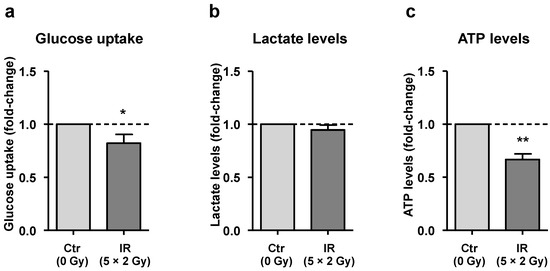 Figure 3. IR affects macrophage metabolism by promoting a reduction of both glucose uptake and total cellular ATP levels. (a,b) Both glucose (n = 12) and lactate (n = 14) levels were determined in conditioned medium (CM) of irradiated (IR, 5 × 2 Gy) and non-irradiated (Ctr, 0 Gy) macrophages. To estimate glucose uptake, glucose levels were subtracted to the initial glucose concentration of RPMI medium. (c) ATP was measured in irradiated (IR, 5 × 2 Gy) and non-irradiated (Ctr, 0 Gy) macrophages after cell lysis (n = 6). Data are represented as the mean ± SEM (* p < 0.05 and ** p < 0.01). A one sample t-test was used for statistical analysis.