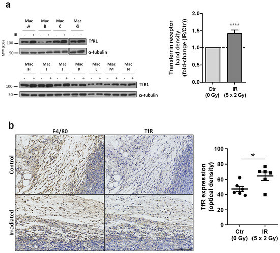Figure 4. TfR1 is upregulated in macrophages irradiated in vitro and in vivo. (a) TfR1 expression was evaluated by Western blot in irradiated macrophages and compared with non-irradiated ones (n = 11). The graph depicts the quantification of TfR1 band intensity, normalized to α-tubulin staining. Data are presented as the mean ± SEM (**** p < 0.0001). A one-sample t-test was used for statistical analysis. (b) Representative images of immunohistochemistry for F4/80 (macrophage marker) and TfR1 in irradiated and non-irradiated mouse breast peritumoral tissue. Scale bar = 100 µm. Semi-quantitative analysis of macrophage TfR1 expression in irradiated (IR, n = 6) and non-irradiated (Ctr, n = 6) animals is depicted. Values represent the mean optical density of TfR1 staining of a minimum of 100 macrophages per animal. Data is presented as the mean ± SEM (* p < 0.05) and each symbol represents one animal. A one-sample t-test was used for statistical analysis. The whole blots (uncropped blots) showing all bands with all molecular weight markers on the Western are provided in the Supplementary Materials.