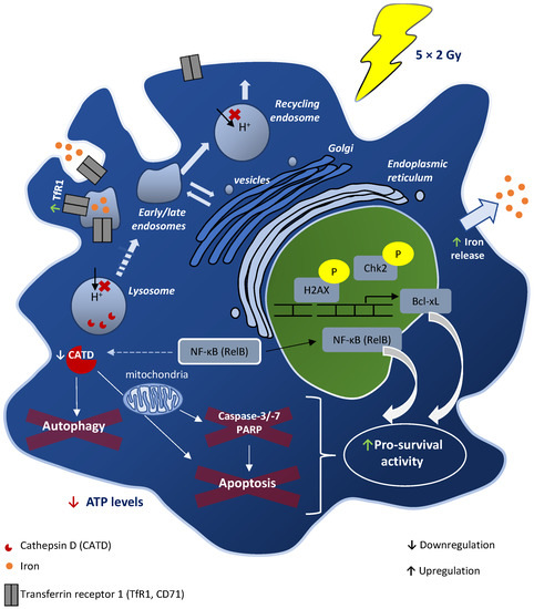 Overall, we speculate that in irradiated macrophages, both cathepsin D downregulation and TfR1 upregulation may be associated with apoptosis suppression and radiation resistance, which could be linked to the previously reported NF-κB RelB subunit activation [23]. Additionally, as TfR1 and mature cathepsin D are considered early-endosomal and lysosome/phagolysosome markers [38], respectively, their deregulated expression in irradiated macrophages may suggest functional alterations in these cellular compartments, supporting a deregulation of transport within the cell (Figure 6). In the future, it would be important to evaluate whether other targets, like Na+/K+ ATPase subunit α-1, could be also associated with macrophage radioresistance.