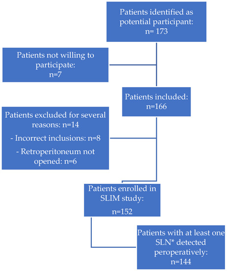 Consecutive patients were enrolled in the SLIM study from the start of SLN mapping in the participating hospitals. The principle was followed that if ICG was injected and the retroperitoneal space was opened, patients were included in the analysis, regardless of SLN mapping result. Patients who withdrew before the study intervention or who did not receive the study intervention (injection of ICG and opening of the retroperitoneal space) were not included in the analyses.