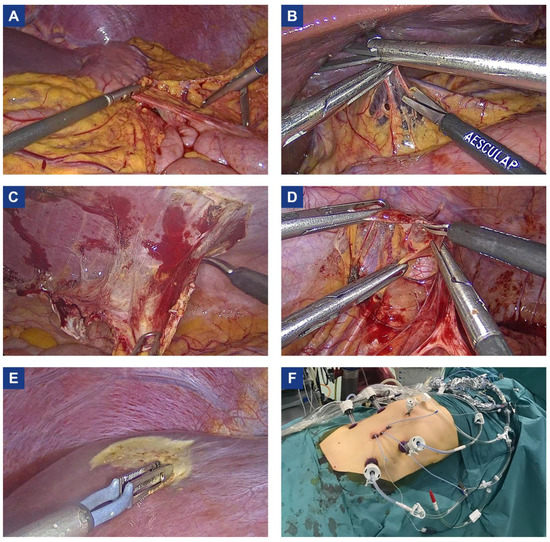 Representative images of laparoscopic cytoreductive surgery and HIPEC. (A) Greater omentectomy; (B) Lesser omentectomy; (C) Parietal peritonectomy; (D) Pelvic peritonectomy; (E) Glisson’s capsule electroevaporation; (F) HIPEC circuit.