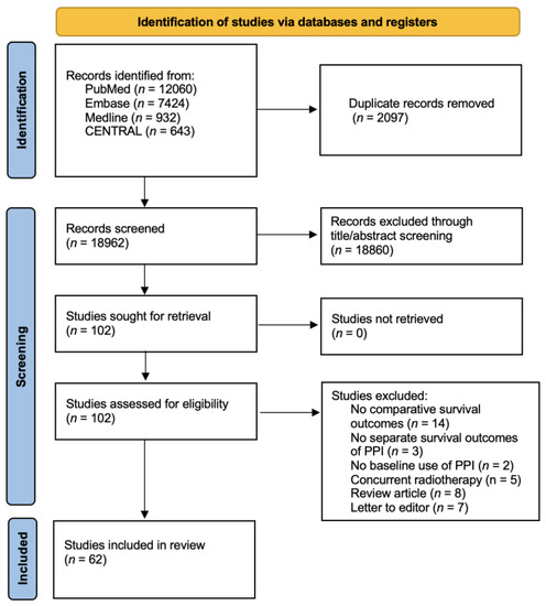 - Liu, C.; Guo, H.; Mao, H.; Tong, J.; Yang, M.; Yan, X. An Up-To-Date Investigation Into the Correlation Between Proton Pump Inhibitor Use and the Clinical Efficacy of Immune Checkpoint Inhibitors in Advanced Solid Cancers: A Systematic Review and Meta-Analysis. Front. Oncol. 2022, 12, 753234. [Google Scholar] [CrossRef] [PubMed]