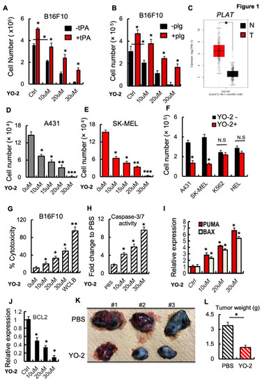 Recent studies indicate that plasminogen activators such as tPA (also known as PLAT) and plasminogen (plg) receptors are TP53 targets that accelerate tumor growth/metastasis [10]. The small-molecule plasmin inhibitor YO-2 induces apoptosis in different hematopoietic and solid cancer cell types [11,12,13]. In addition, we observed that YO-2 treatment downregulated LRP1 in melanoma cells [2].