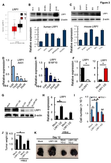 Next, we examined the transcript levels of LRP1 in response to 10, 20, and 30 μM YO-2 treatment. YO-2 dose-dependently decreased LRP1 expression in A431 and B16F10 cells (Figure 2D,E), suggesting that YO-2 impairs LRP1 expression in melanoma cells. We established B16F10 cells where we gene-silenced LRP1 (si-LRP1) or overexpressed LRP1 using a lentivirus (LRP1 OE). We confirmed LRP1 expression by qPCR and Western blotting (Figure 2F,G). YO-2 treatment of Mock and LRP1 OE cells reduced LRP1 expression (Figure 2H). Consistent with the role of LRP1 in melanoma cell growth, we found that LRP1 OE enhanced melanoma cell growth (Figure 2I). YO-2 treatment reduced melanoma proliferation in Mock and LRP1 OE expressing, but not LRP1 KD cells (Figure 2H,I) in vitro, and tumor growth in Mock and LRP1-OE tumors in vivo (Figure 2J,K). These data indicate that the antiproliferative effects of YO-2 were linked to cellular LRP1 expression.