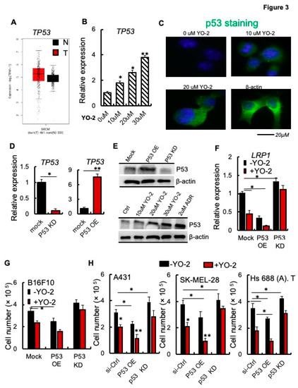 Recently, LRP1 has been identified as a downstream target of the tumor suppressor gene p53 (also called TP53) in MEF1 and colon cancer cells [6]. TP53 is not differentially expressed in malignant melanoma cells (T) and normal (N) skin tissues of patients with SKCM (Figure 3A). We determined TP53 expression after YO-2 exposure in melanoma cells. The wild-type, unmuted form of TP53 is prevalent in melanoma cells. The murine cell line B16F10 maintains functional wild-type TP53. Thus, we examined if YO-2 augmented TP53 transcript and protein expression, which indeed was the case as shown by qPCR and immunohistochemistry (Figure 3B–D). Next, we established B16F10 cells in which we knocked down p53 (P53 KD) or overexpressed TP53 using a lentivirus (P53 OE). We confirmed TP53 expression by qPCR and Western blotting (Figure 3D,E, upper panel). TP53 protein was upregulated in B16F10 cells following treatment with various YO-2 doses compared to untreated control cells (Figure 3E, lower panel). The well-established TP53-inducing drug doxorubicin served as a positive control.