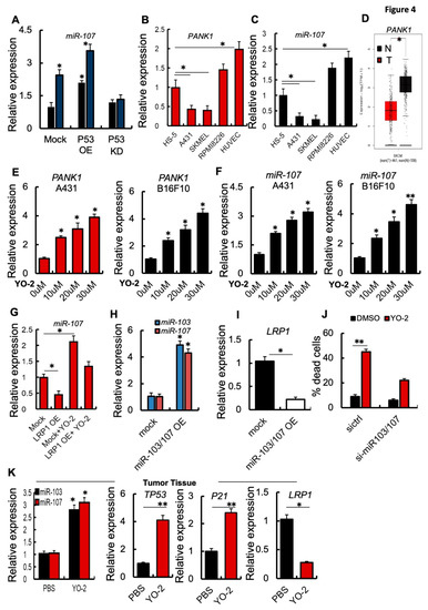 YO-2 restores tumor suppressor miR-107/103 expression. (A) Fold change in miR-107 expression in P53 OE and P53 KD murine B16F10 cells treated with/without 10 μM/mL YO-2 following a 24 h culture period. In addition, expressions were compared to untreated Mock controls. (B,C) Fold change in human PANK1 and miR-107 expression in HS-5, A431, SK-MEL-28, and HUVEC cells. The expression was compared to the expression in HS-5 cells (n = 3/cell line). (D) Human PANK1 expression levels in tumors (T) and adjacent normal tissues (N) derived from SKCM patients. Data were retrieved from the TCGA database and analyzed by Timer (p < 0.05). (E,F) Human A431 and murine B16F10 cells were cultured with or without indicated concentration of YO-2 for 24 h. Fold change in human and mouse PANK1 (E) or miR-107 (F). Expressions were compared to expression in untreated control cells. (G) Fold change in miR-107 expression determined by qPCR in mock or LRP1 OE cells treated with/without YO-2 (n = 3/group). The expression was compared to untreated Mock cell expression. (H) Fold change in miR-103 and miR-107 expression in miR-103/107 OE compared to its expression in mock B16F10 cells as determined by qPCR (n = 3/group). (I) Fold change in LRP1 expression in miR-103/107 OE B16F10 cells compared to mock controls by qPCR (n = 3/group). (J) si-miR-107 and si-ctrl B16F10 cells were treated with/without YO-2. The percentage of dead cells was determined after 24 h in culture (n = 3/group) by trypan blue extinction. (K) Fold change in miR-103, miR-107, TP53, P21, LRP1 expression in tumor tissues of the carrier (PBS) and YO-2-treated mice at day 12 compared to the expression in control tissues taken on day 0 as determined by qPCR (n = 3/group). Data are expressed as mean ± SEM (unpaired Student’s t-test or one-way ANOVA; * p < 0.05, ** p < 0.01).