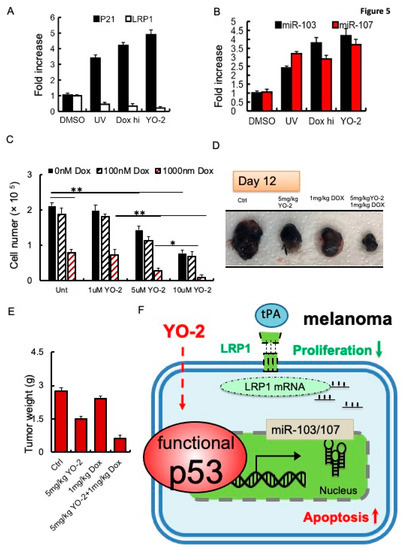 Increased sensitivity of doxorubicin to control tumor growth in YO-2-treated tumors. (A,B) Fold change in P21 and LRP1 (A), and miR-103 or miR-107 (B) expression in UV-exposed, doxorubicin (high)-, and 10 μM YO-2-compared to DMSO-treated B16F10 cells (n = 3/group). We normalized most genes to b-actin. mi-103 and miR-107 expression were normalized to U6 gene expression. All data are presented as a relative fold change to controls according to the comparative Ct method (2−ΔΔCt.) and represented as mean ± SEM, with p values from unpaired Student’s t-test. * p < 0.05, ** p < 0.01. (C) The proliferation of B16F10 cells treated with/without YO-2 in the presence/absence of low (100 nM) and high doxorubicin (1000 nM) (n = 3/group) as determined by counting cells 24 h after cell plating (n = 6/group). (D,E) B16F10 cells were injected s.c. into the right flanks of C57/BL6 mice. Mice were treated with a single dose of doxorubicin on day 5, and cotreated with/without YO-2 in the indicated groups every other day starting from day 5. Twelve days after injection, tumor weight was measured (E; n = 6/group), and macroscopic tumor images were taken (D). * p < 0.05, ** p < 0.01 (F) Proposed mode of action for YO-2 in melanoma: YO-2 upregulates TP53 (also called p53) upregulating miR-103/miR-107, which targets the LRP1 transcript. Due to the lower LRP1 expression, tPA cannot enhance proliferation in melanoma cells. Abbreviations: LRP1, low-density lipoprotein receptor-related protein 1, miR-103, micro-RNA-103.