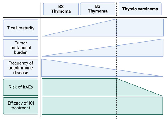Considering the T cell infiltrate usually found in thymoma, B3 thymomas and thymic carcinoma should be the two entities that provide the most beneficial risk-benefit-assessment for an immunotherapeutic approach. The high prevalence of mature T cells in these tumor types provides cellular targets for a successful enhancement of the antitumoral immune response. The increased risk for irAEs in thymoma of type A/B/B1 and B2 could be explained by their immune microenvironment including a plethora of immature T cells that may evade physiological selection mechanisms.