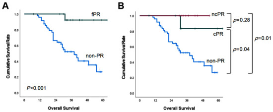 The median follow up was 39 months (95% confidence interval (CI): 31–47 months). In the fPR group, the median OS could not be calculated because more than half of them were still living. The median OS of the fPR group was longer than that of the non-PR group (more than 60 months versus 38 months; p < 0.001; Figure 1A). The median OS of the cPR group and the ncPR group was superior to that of the non-PR, respectively (cPR versus non-PR (p = 0.04) and ncPR versus non-PR (p = 0.01) (Figure 1B)).