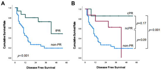 The median DFS of the fPR group was also superior to that of the non-PR group (more than 42 months versus 10 months, p < 0.001; Figure 2A). It was not significantly different in the cPR versus ncPR comparison (p = 0.17), nor in the ncPR versus non-PR comparison (p = 0.09) (Figure 2B).